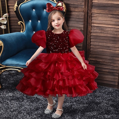 Abito da damigella d'onore bambina Ragazze Abito formale Abiti da sposa Feste Matrimonio Formale Principessa Paillettes Rete Tinta unica Manica Corta Girocollo Blu Nero Dai 4 anni in su
