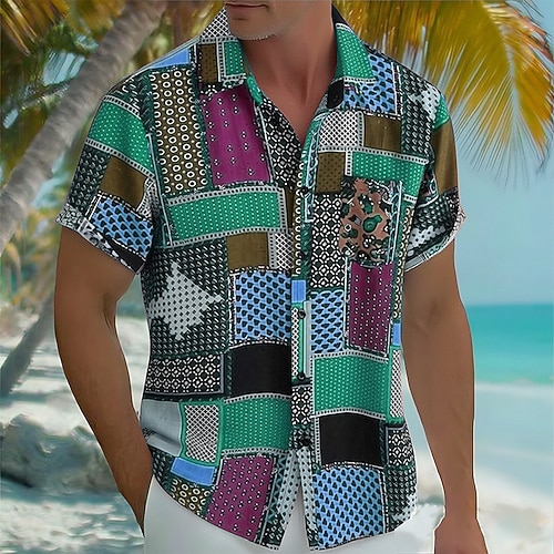 Herren Farbblock Patchwork Boho Hemd Sommerhemd Knopfhemd Kurzarm Vintage-Retro Alltagstauglich Strandurlaub Sommer Umlegekragen 3D-Druck Eine Tasche vorne Leinenähnliches Hemd Rote Grün
