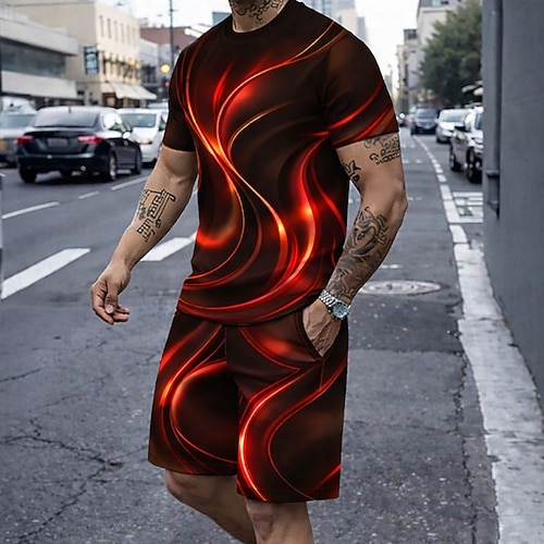 Herren Geometrisch Linie 2St T-Shirts-Sets Sommeroberteile Kurzarm Kurze Hosen Rundhalsausschnitt Lässig Trendy Täglich Outdoor Urlaub 3D-Druck Sommer Blau Rote Braun