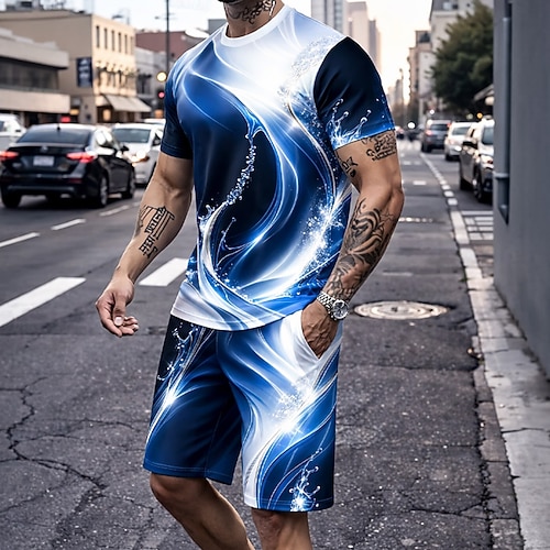 Herren Geometrisch Linie 2St T-Shirts-Sets Sommeroberteile Kurzarm Kurze Hosen Rundhalsausschnitt Alltagstauglich Urlaub Ausgehen 3D-Druck Sommer Blau Schwarz Rote