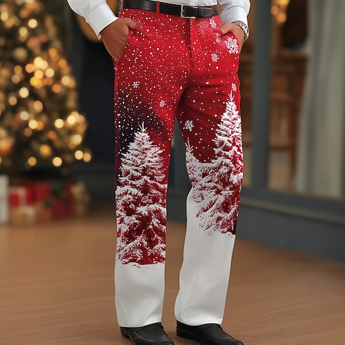 Weihnachten Herren Weihnachtsbaum Schneeflocke Hose Anzughose Mittlere Taille Lässig Party Ferien Relaxed Fit Anzughose mit flacher Vorderseite und Seitentaschen Herbst Winter 3D-Druck Rot 1 Rote