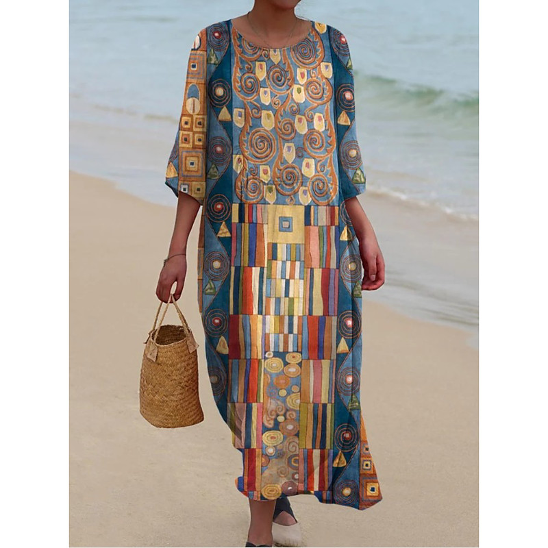 Women's Maxi Dress Kaftan 3/4 Length Sleeve Crew Neck Casual A Line Dress Dress Boho Graphic Geometric Yellow Red Light Brown Brown