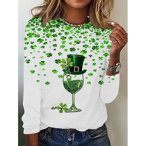 T-Shirt da donna di San Patrizio con grafica Shamrock Bicchiere di Vino Moda Stilosa Classica Maniche Lunghe Collo Crew Collo Rotondo Top Regolari Stampa Quotidiana Weekend Bianco Verde Scuro Verde