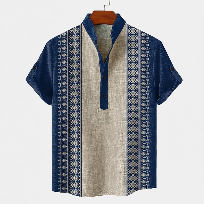Men's Shirt Button Up Shirt Short Sleeve Vintage Casual Tribal Vacation Daily Summer Spring Band Collar grandad collar Print Green Khaki Beige