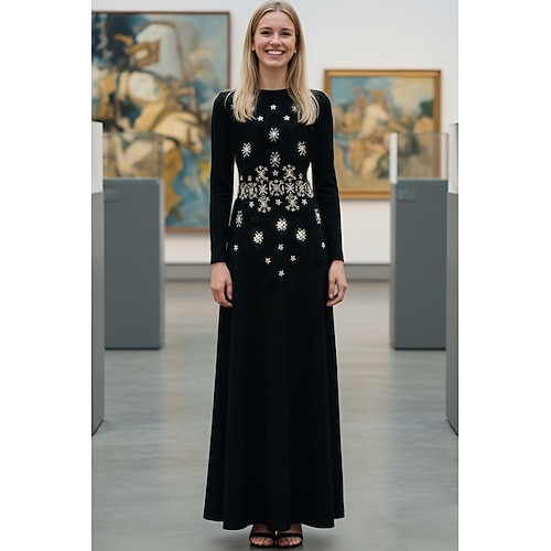 Abito Formale O-Line fino al Pavimento Abito da Sera Abito da Sera Elegante Vintage Maniche Lunghe Collo A Giro Abito da Festa di San Valentino con Cristalli Perline