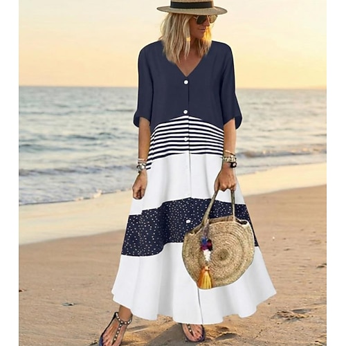 abito casual da donna abito svasato abito lungo maxi abito marrone mezza manica bottoni color block primavera estate scollo a V basic 2023 5xl