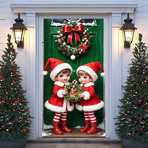 Copriporta natalizio, tende natalizie con bambina in abito natalizio rosso e bianco con ghirlanda e albero di Natale stampato per ingresso, soggiorno, camera da letto, decorazione festiva