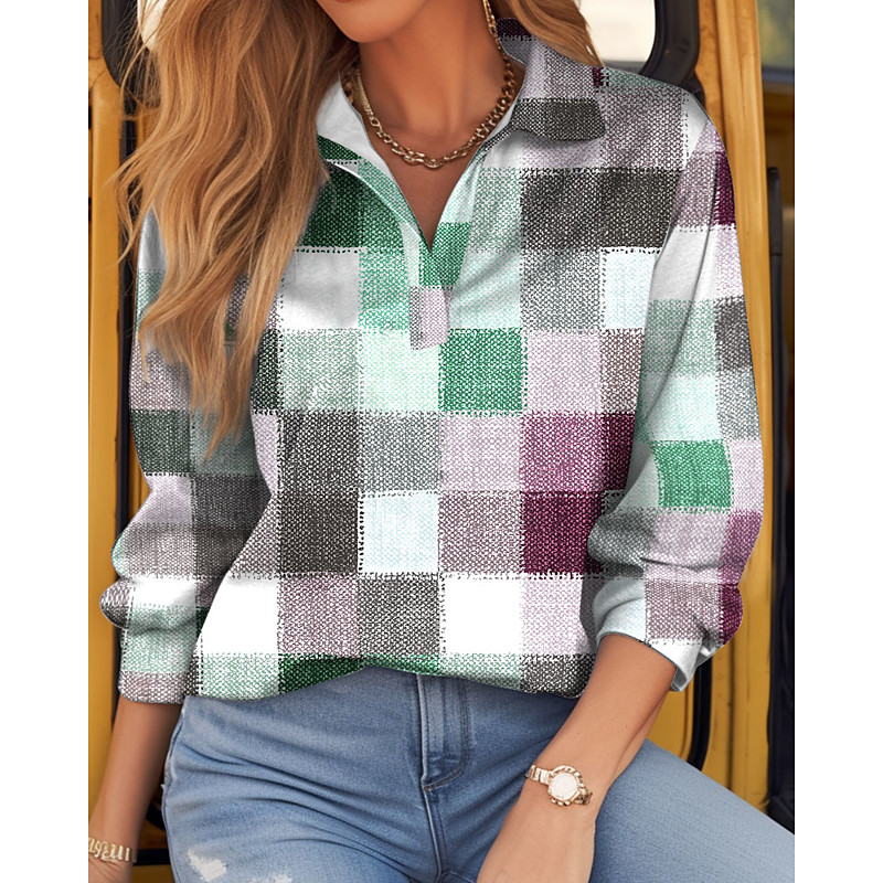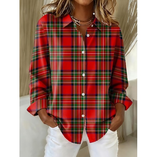 Women's T shirt Long Sleeve Plaid Basic Long Sleeve Shirt Collar Regular Tops Daily Weekend Print Light Green Red Green Khaki Gray Spring Fall Prefall