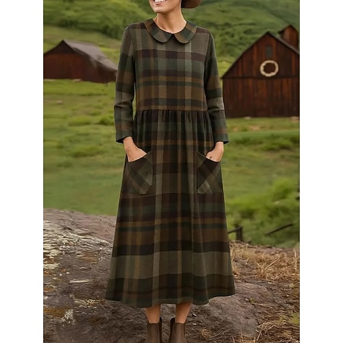 Per donna Abito Midi Tubino Abito Pieghettato Vacanza Casual Boho Ferie Abito Primaverile Vestibilità regolare Plaid Manica Lunga Girocollo Blu Marrone chiaro Marrone Primavera Autunno
