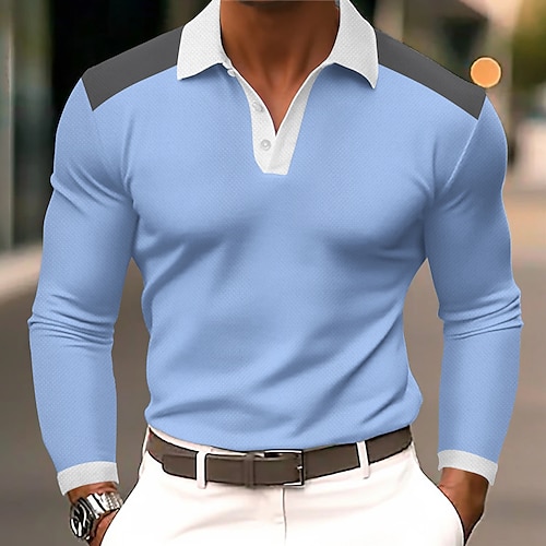 Herren Farbblock Polo Langarm Polo-Shirts Revers Lässig Outdoor Athleisure Alltagskleidung Knöpfe Frühling Herbst Blau Schwarz Marineblau