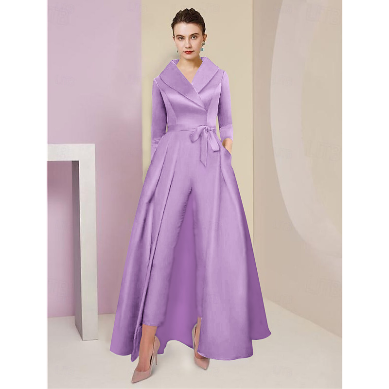 Jumpsuit Pantsuit Ankle Length Mother of the Bride Dress 3/4 Length Sleeve Shirt Collar Elegant Party Simple Formal Wedding Guest Satin with Bow(s)