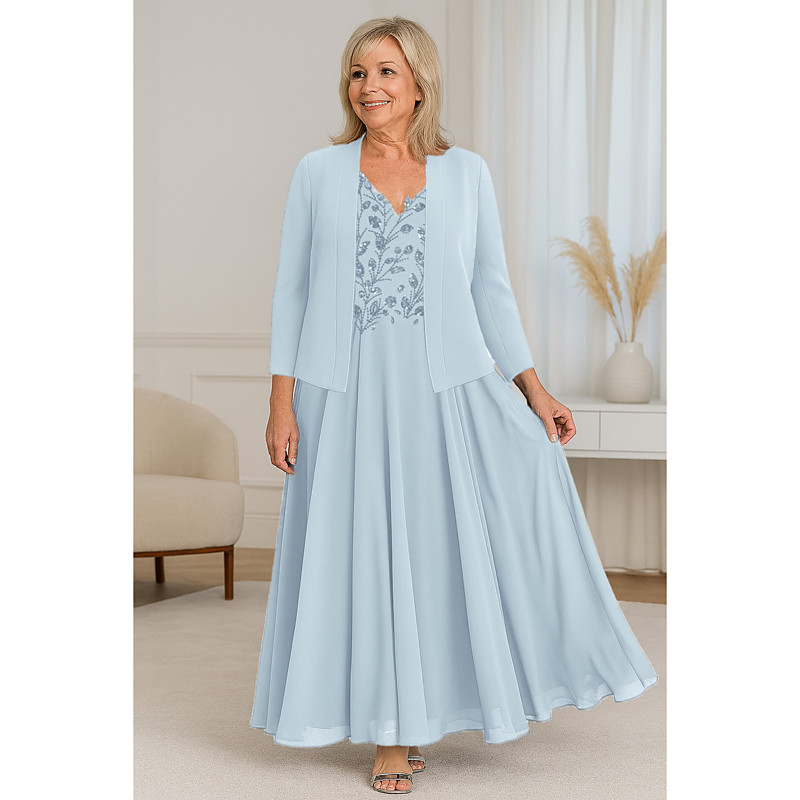 Two Piece A-Line Floor Length Wedding Guest Dress Mother of the Bride Dress Short Sleeve V Neck Elegant Simple Luxurious Formal Wedding Guest Chiffon Crepe with Lace Beading