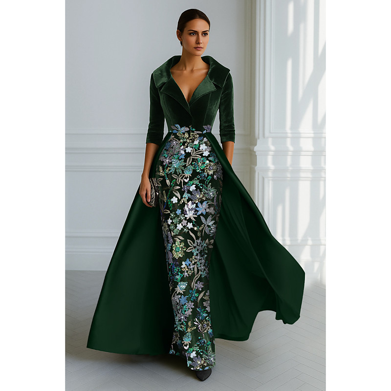 A-Line Sheath Column Floor Length Beaded Eembroidered Wedding Guest Dress Formal Dresses Mother of the Bride Dress 3/4 Length Sleeve V Neck Shirt Collar Elegant Vintage Luxurious Formal Satin with