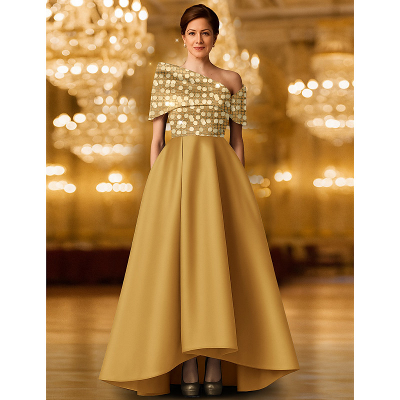 A-Line Floor Length Beaded Eembroidered Formal Dresses Mother of the Bride Dress Evening Gown Ball Gown Formal Dress Elegant Glittering Black Dress Short Sleeve One Shoulder Wedding Formal Capes