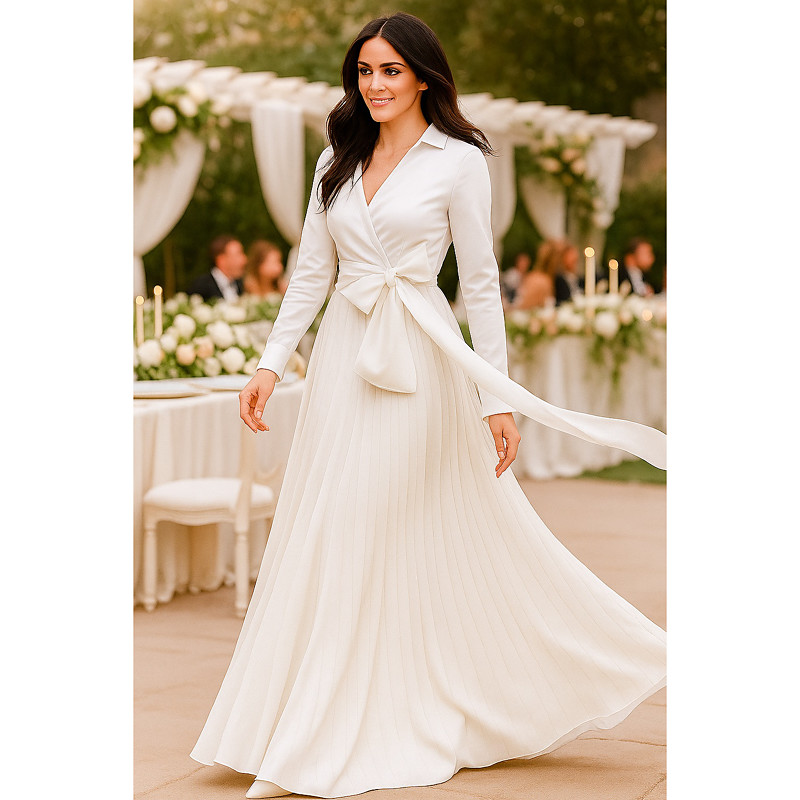 A-Line Floor Length Satin Dress Wedding Guest Dress Formal Dresses Mother of the Bride Dress Long Sleeve Shirt Collar Elegant Vintage Formal Wedding Guest Church Chiffon Satin with Bow(s) Pleats