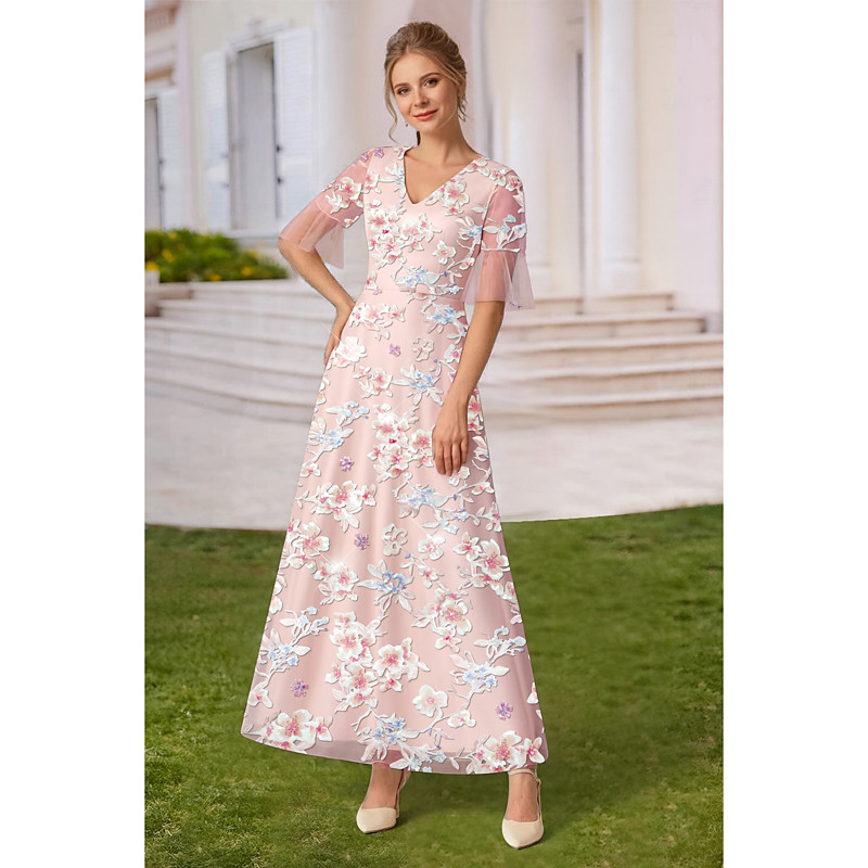 A-Line Dress Ankle Length Party Dress Cocktail Dress Wedding Guest Dress Mother of the Bride Dress Short Sleeve V Neck Elegant Vintage Formal Wedding Guest with Embroidery Flower
