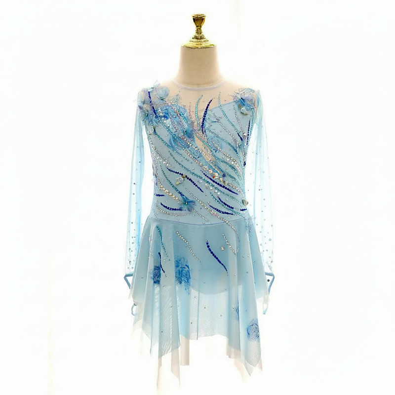 Figure Skating Dress Women's Ice Skating Dress Sky Blue Patchwork Asymmetric Hem Spandex Mesh High Elasticity Training Competition Skating Wear Classic Crystal / Rhinestone Long Sleeve Ice Skating