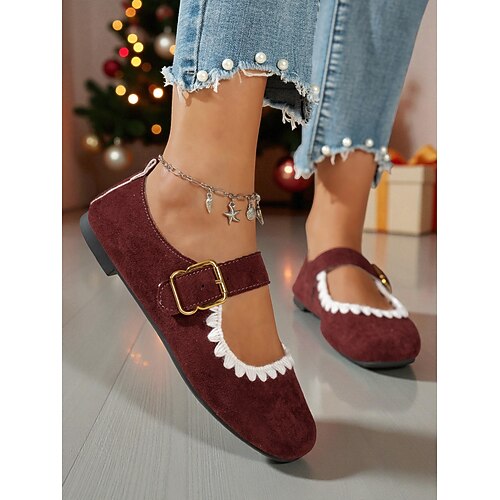 Burgunderrote Mary-Jane-Ballerinas für Damen – verspielter Vintage-Stil mit Schnallenriemen, weicher Tragekomfort, ideal für Weihnachtsfeiern, den Alltag, die Arbeit und als Weihnachtsgeschenk