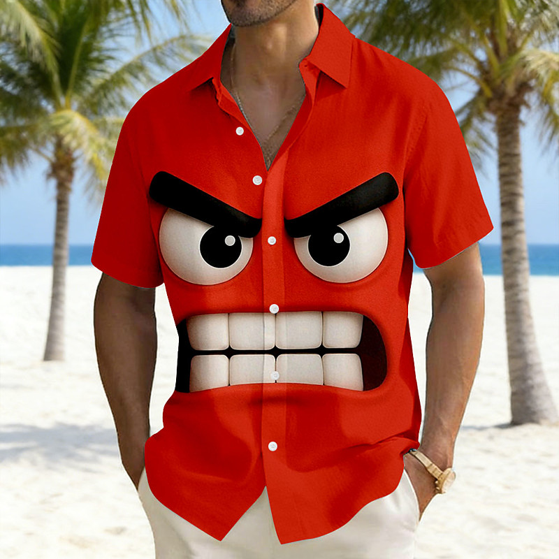 Men's Optical Illusion 3D Cartoon Angry Face Shirt Summer Shirt Button Up Shirt Short Sleeve Funny Outdoor Vacation Dailywear Summer Turndown 3D Print Linen Like Shirt Blue Yellow Red Purple Green