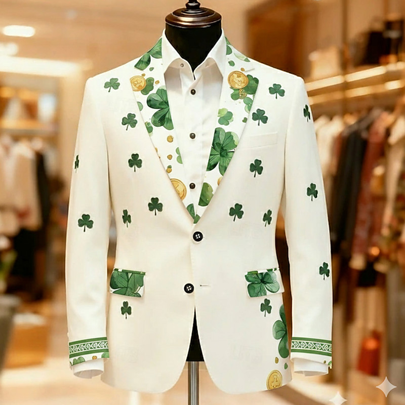 St. Patrick Men's Shamrock Blazer Jacket Coat Comfortable Casual Breathable Artistic Casual Daily Party Evening Wear Festival 3D Print Buttons Multi Pocket All Seasons Notch Long Sleeve White