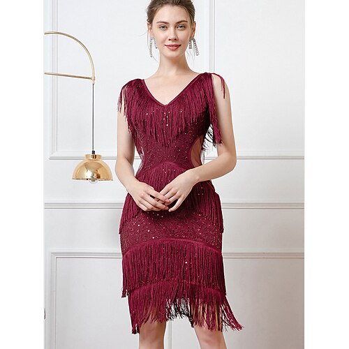 Anni Ruggenti Anni 1920 Lunghezza al ginocchio Abito Flapper Senza maniche Il grande Gatsby Paillettes Frange Scollo a V Costume Per donna Natale Carnevale Mascherata Festa a tema retrò Danza