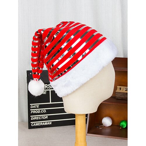 Cappello natalizio a righe in velluto da donna – materiale in poliestere, strisce rosse e verdi festive con pompon bianco, perfetto per feste e celebrazioni stagionali