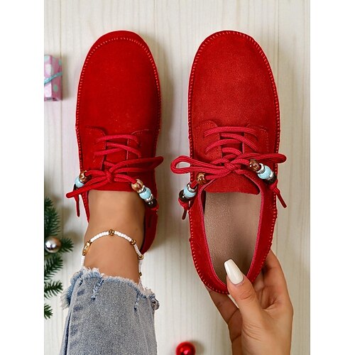 mocassini rossi da donna con lacci perline - comode slip-on da donna per le vacanze - ideali per Natale, comfort invernale e giornate informali
