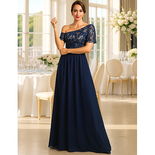 Abito Formale O-Line fino al Pavimento Abito da Sera Abito per la Madre della Sposa Maniche Corte Spalla Scoperta Elegante Vintage Lussuoso con Ricamo in Pizzo