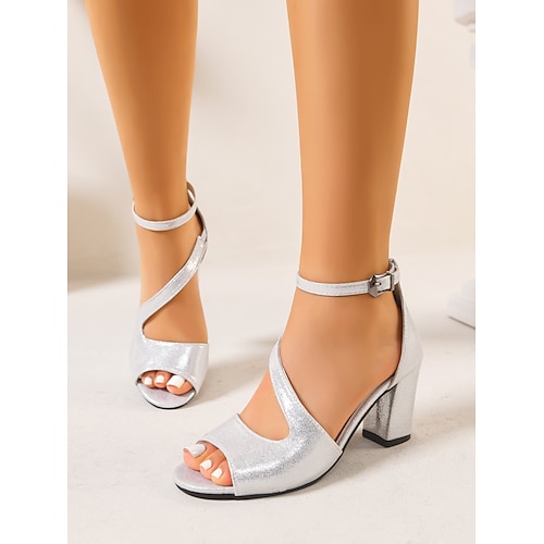 Per donna Quotidiano Tacco grosso Punta aperta Moda Finta Pelle Cinturino alla Caviglia Argento Oro