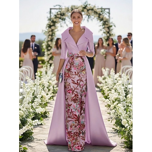 Linea ad A Tubino Colonna Lunghezza al pavimento Perline ricamate Abito da invitata a nozze Abito Formale Abito da cerimonia per signora Manica 3/4 Scollo a V Colletto a Camicia Elegante Vintage