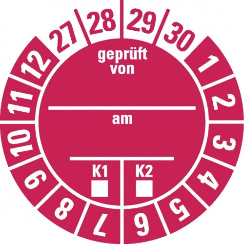Dreifke® Prüfplakette geprüft von...am...K1 K2 27-30,rot,Dokumentenfolie,Ø 30mm,18 St/Bogen
