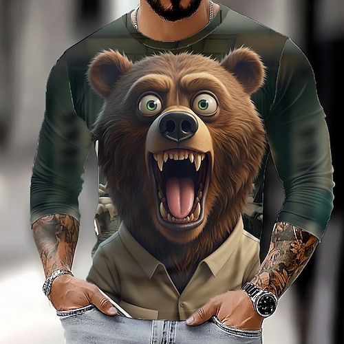 Herren Bär T Shirt Langarm T-Shirt 3D-Druck Rundhalsausschnitt Hemd Mode Basic Straße Lässig Täglich Schwarz Braun Sommer Frühling Bekleidung S M L XL XXL XXXL