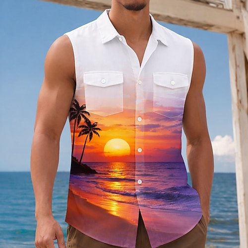 Per uomo Albero di Cocco Natura e paesaggi Tramonto Camicia Camicia hawaiana estiva Camicia Aloha Senza Maniche Resort Vacanza al Mare Estate Primavera Collo ripiegato Stampa 3D Due tasche anteriori