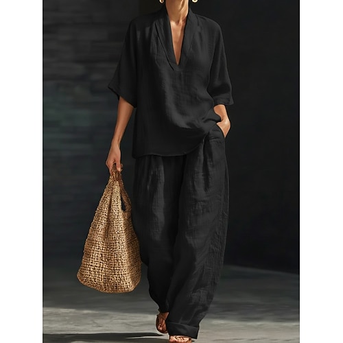 Per donna Camicia Set di biancheria in cotone Set da due pezzi Pantaloni di Lino Pantaloni Manica Lunga Colletto a Camicia Tinta unica Moda Streetwear Abbigliamento quotidiano Data Nero Rosa scuro