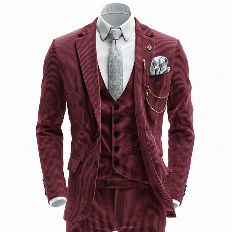 Men's Business Wedding Corduroy Suit Notch Lapel Burgundy Mint Green Business Formal Striped Tailored Fit 3 Piece Single Breasted Two-buttons