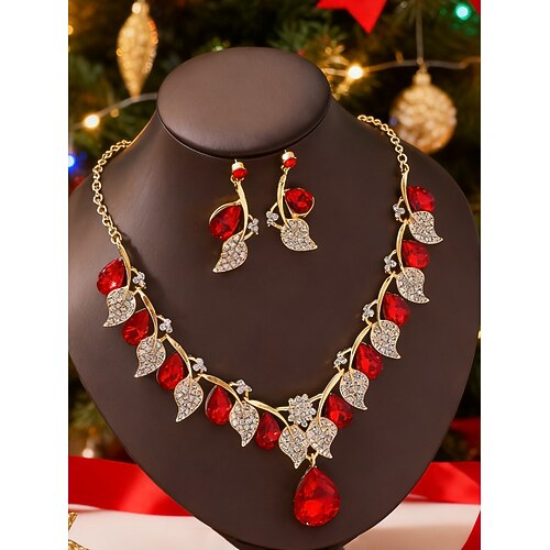 Damen-Set mit roter Kristallkette und Ohrringen, 2-teilig, eleganter vergoldeter Schmuck für Weihnachtsfeiern, Weihnachtsgeschenke Abendoutfits
