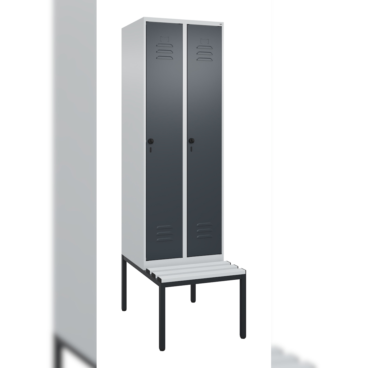 C+P Spind Classic PLUS, Kunststoff untergebaute Sitzbank, 2 Abteile, HxBxT 212x60x82cm, Sicherheitsdrehriegel, Hellgrau/Anthrazit von PROREGAL