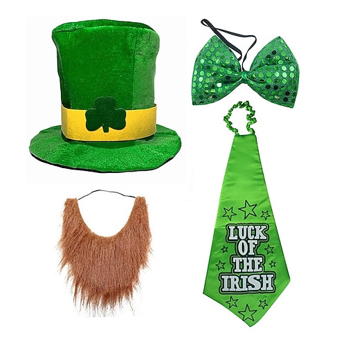 Set di accessori per la festa di San Patrizio composto da un cappello a cilindro in velluto verde, barba finta, papillon e cravatta. Accessori unisex per le feste a tema irlandese per adolescenti e