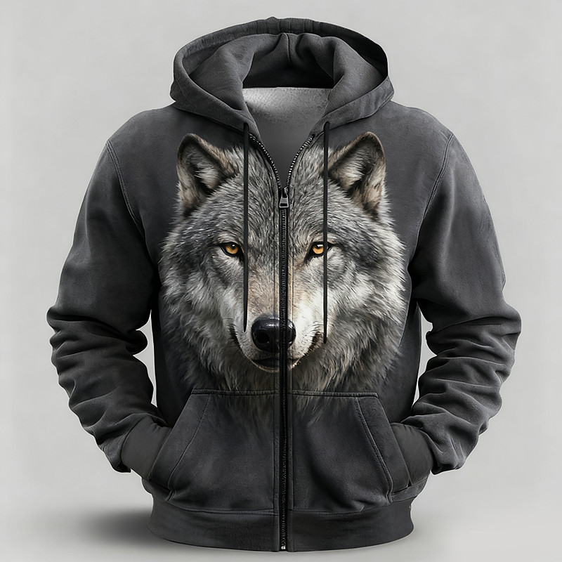 Men's Wolf 3D Hoodie Jacket Sweatshirt Fantasy All Over Print Zip Vacation Going out Streetwear Black Khaki Dark Gray Zipper Fall Winter Designer S M L XL XXL XXXL