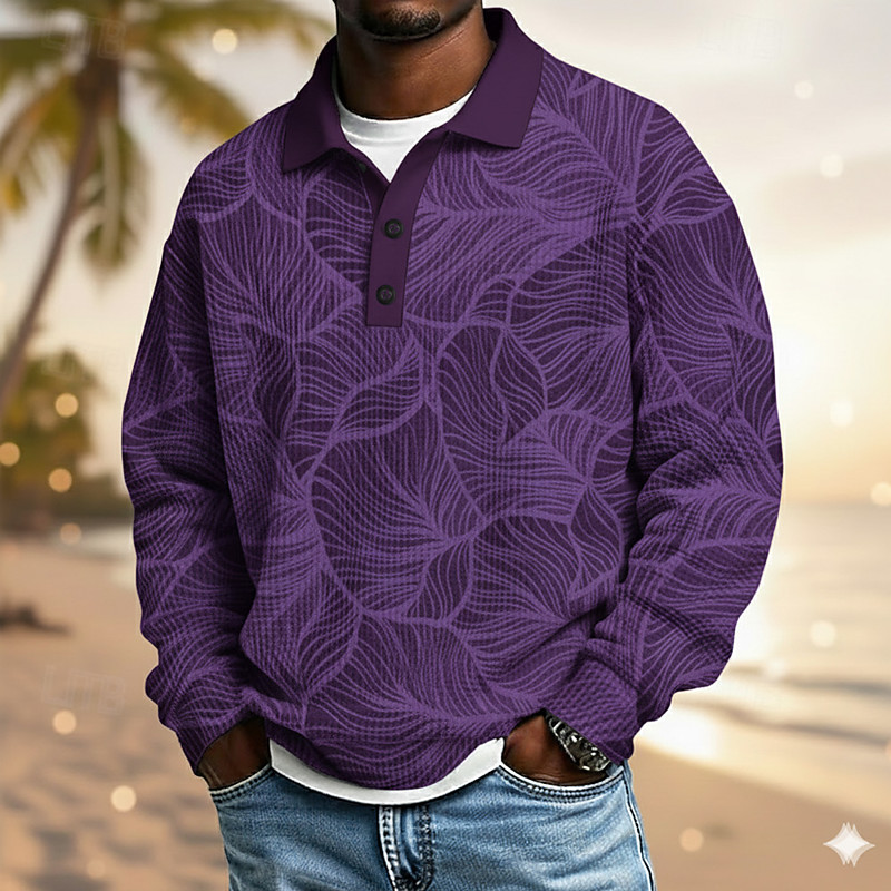 Men's Leaf Plants Waffle Polo Shirts Long Sleeve Polo Shirts Lapel Casual Resort Athleisure Hawaiian Daily Wear 3D Print Spring Fall Winter Blue Purple Green