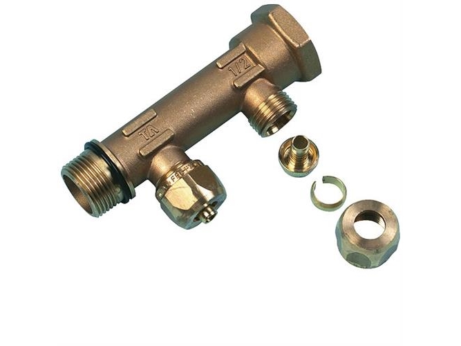 Uponor Aqua PLUS fordelerrør. Fast muffe. PEX WTR DR G3/4 MT/FT 2x15mm pex klemrings koblinger c/c 50mm. Afzinkningsfri messing.
