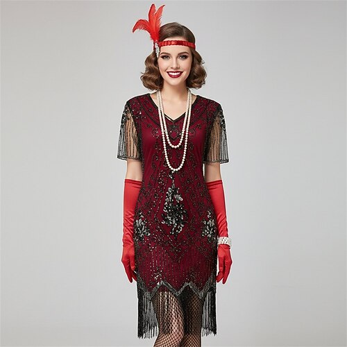 Anni Ruggenti Anni 1920 Lunghezza al ginocchio Abito Flapper Maniche corte Il grande Gatsby Ragazza Flapper Paillettes Frange Scollo a V Costume Per donna Natale Carnevale Mascherata Festa a tema