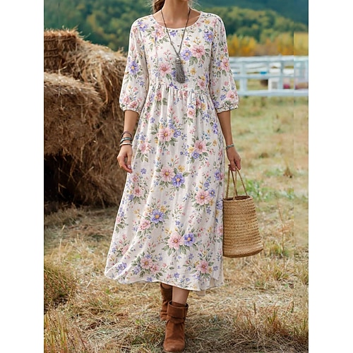 Abito lungo da donna in lino simile traspirante leggero abito a cambiamento estivo abbigliamento da vacanza casual boho spiaggia festa geometrico a maniche 3/4 collo giro blu bianco rosa marrone
