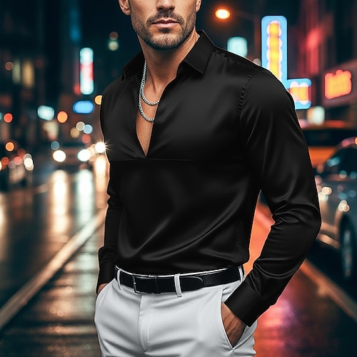 Per uomo Camicia Camicia in raso Camicia elegante Camicia casual Camicia con Bottoni Camicia da Ballo Semplice Formale Matrimonio Nero Blu marino Manica Lunga Scollo a V Tutte le stagioni