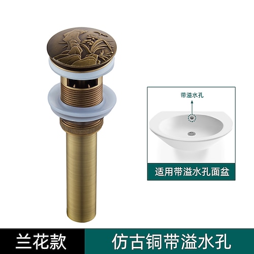 Ottone anticato inciso, tappo di scarico per lavandino del bagno, senza foro di troppopieno, sifone per lavabo da cucina