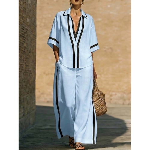 Per donna Set di Pantaloni Manica Corta Colletto a Camicia A righe Moda Streetwear Casuale Quotidiano All'aperto Blu Nero Bianco Estate Vestibilità regolare