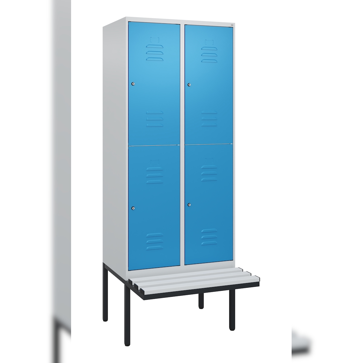 C+P Spind Classic PLUS, schwebender Sitzbank aus Buche 4 Abteile, HxBxT 212x120x82cm, Sicherheitsdrehriegel, Hellgrau/Lichtblau von PROREGAL