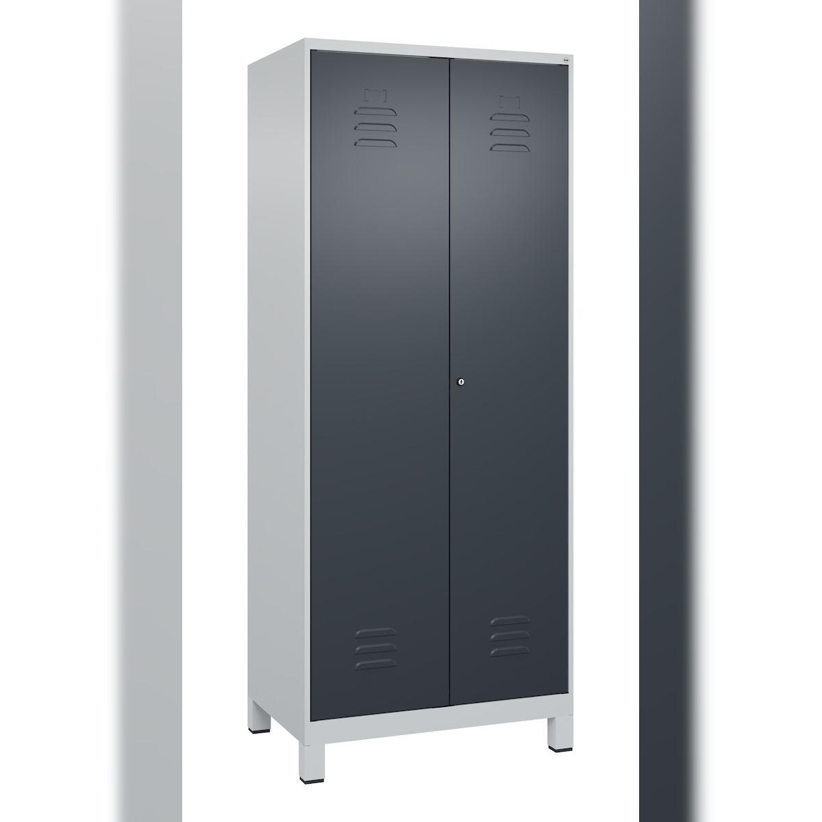 C+P Aufbewahrungs Doppel-Spind Classic PLUS, Füßen, 2 Abteile je 4 Fachböden, HxBxT 195x80x50cm, Zylinderschloss, Hellgrau/Anthrazit von PROREGAL