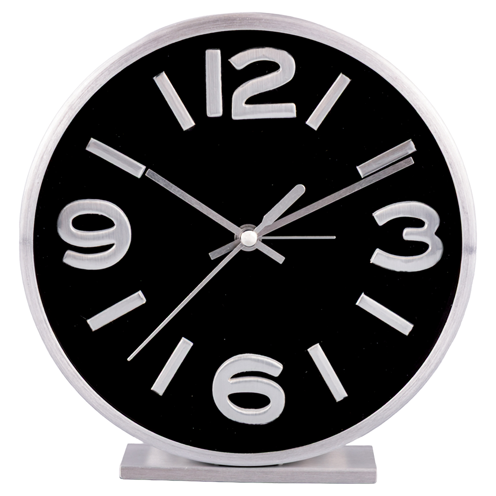 <p>Orologio tondo da tavolo con sveglia 15 cm in stile modern retrò, silver e nero, Sibilla</p>