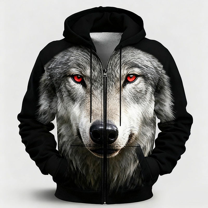Men's Wolf Hoodie Jacket Sweatshirt Fantasy All Over Print Zip Vacation Going out Streetwear Black Dark Gray Zipper Fall Winter Designer S M L XL XXL XXXL